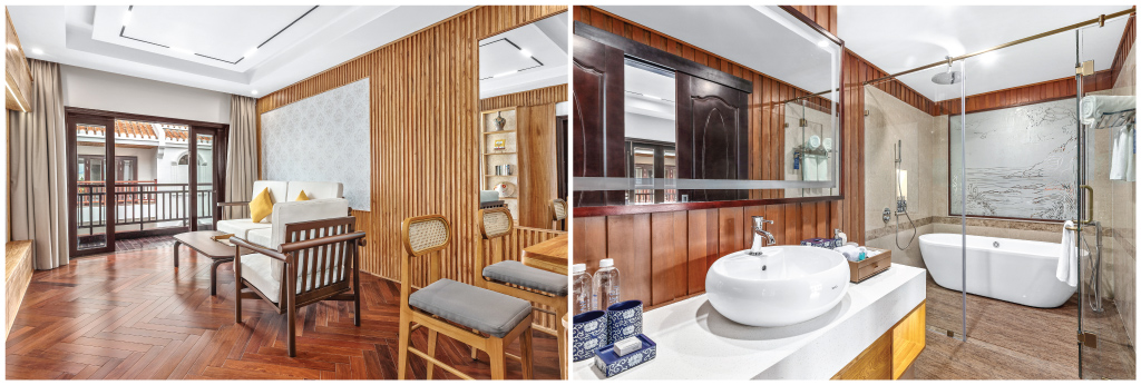 Khi bước vào Royal Garden, du khách sẽ được đắm mình trong không gian tĩnh tại với những lối đi lát đá quanh co, hồ sen và sân gạch lung linh ánh đèn lồng, gợi nhắc những khu vườn cổ kính của Hội An. Khu vực này bao gồm 16 phòng suite được chia thành ba hạng phòng độc đáo: Big Suite, Bigger Suite và Seagull Suite – đây là phòng suite rộng nhất và đẳng cấp nhất trong bộ sưu tập.